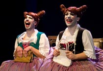 Obučeni u krinoline i s baroknim šminkanjem, napadno bijela lica, dvojica glumaca potpuno dominiraju scenom u nizu koreografskih ostvarenja, realiziranih vrlo energično i s pravim osjećajem za mjeru između groteske, ozbiljnosti i karikature. Upravo karikaturalnost likova sestara Ibru je pokazatelj kvalitete i osjećaja za mjeru dvojice glumaca ...pročitajte cijeli tekst...