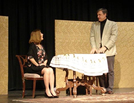 Budući da je riječ o relativno jednostavnom sižeu koji teče u realnom vremenu, uz fiksnu scenografiju i svjetlo, predstavu nose glumci hipertrofiranom glumom, oblikujući zanimljive karikature. Matija Prskalo igra pomalo histeričnu, pomalo očajnu, no lijepu i energičnu ženu srednje dobi, vrlo živog libida, koja žudi za partnerstvom. Njezin je partner Zijad Gračić, markantan glumac koji i više nego uspješno nosi ulogu šarmantnog sumnjivog poduzetnika različitih interesa. Snaga predstave leži u činjenici da je podjela uloga idealna za ovakvu inscenaciju, sama specifična fizionomija glumaca stvara temelj za interpretaciju uloga, a njihove prenaglašene geste i grimase dinamiziraju dijalog koji nije lako održavati u kontinuitetu kroz više od sat vremena izvedbe. Redatelj Zoran Mužić, inače autor s istančanim osjećajem za komiku i smislom za humor, iskoristio je puni potencijal podjednako teksta i izvođača kako bi dobio zaista zabavnu zaokruženu predstavu.