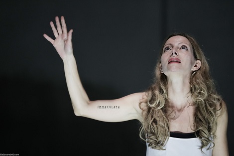 U Bezgrešnoj je Nataša Matjašec Rošker intenzitet igre i raznovrsna, ponekad neočekivana glumačka rješenja upotrijebila na gotovo suprotan način, pretvorivši ikonu u ženu koja neizdrživo pati. U toj nevjerojatno dojmljivoj interpretaciji Marija gubi nadnaravne moći i svetost da bi se iskazala kao ljudsko biće koje ne može izdržati težinu svog gubitka. Time Marija kao žena koja osjeća nepojmljivu bol postaje sugestivna nositeljica Pandurove težnje pronalaženja Poezije i Istine na kazališnim daskama. A u ovoj iznimno vrijednoj predstavi u režiji Livije Pandur i tumačenju Nataše Matjašec Rošker ta je Istina da ništa, pa niti jedna vjera ili ideologija ne zaslužuju da budu izgrađene na smrti i da tako nanose bol ljudskom biću..jpg)