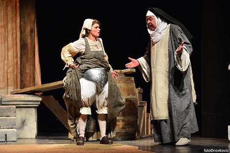 Scena ocrtava i karikira u skladu s farsom (seoska župa, drvena kućica, bačva, štrik, okrugli stupovi koji podsjećaju na umjetnost starog Rima, stepenice), dajući prednost radnji.