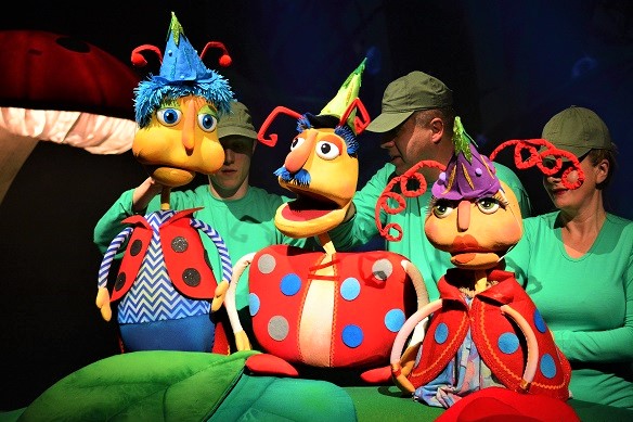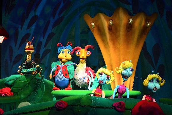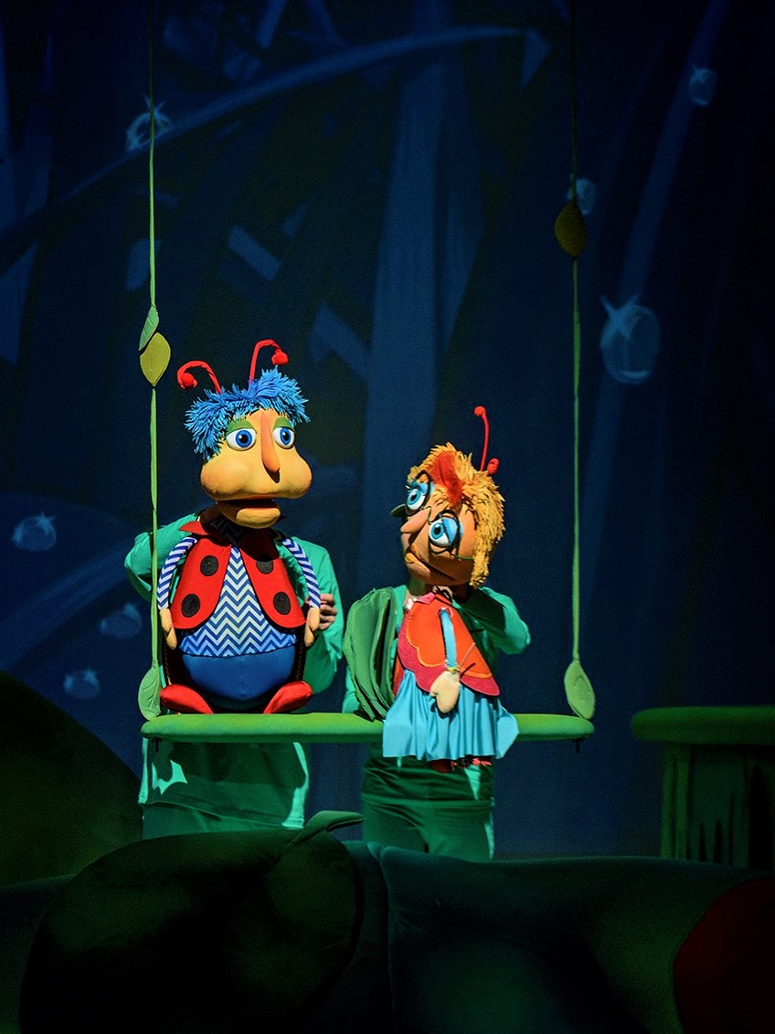 Rješenje lutaka (oblikovateljica Irina Somborac) sasvim je stereotipno i ničim ne plijeni pozornost, osim šarenilom, koje podsjeća na trgovinu igračkama. Slično je i sa scenografskim rješenjem (Davor Antolić-Antas), kojemu se ne može prigovoriti nefunkcionalnost, ali je jednako neinspirativno i uglavnom očekivano. Animacija lutaka, koje opravdano ulijeću i lete scenom (ipak su bube), pokazuje se podosta nekonzistentnom. Prvo, lutaka je mnogo, na trenutke i previše te nisu sve jednako funkcionalne nego poneke djeluju kao dekoracija, dio scenografije, a ne animirani likovi. Tome pridonosi i rješenje u kojem neke lutke otvaraju usta, dok druge to ne čine, iako govore. Općenito, u animaciji predstave osjeća se zasićenost prevelikim brojem lutaka, čija rješenja nisu posebno zanimljiva te djeluju odrađeno. A potencijala je bilo, što pokazuju primjerice neka rješenja svjetla u prijelazima između prizora i povezanosti sa songovima (oblikovatelj Igor Matijevac).
