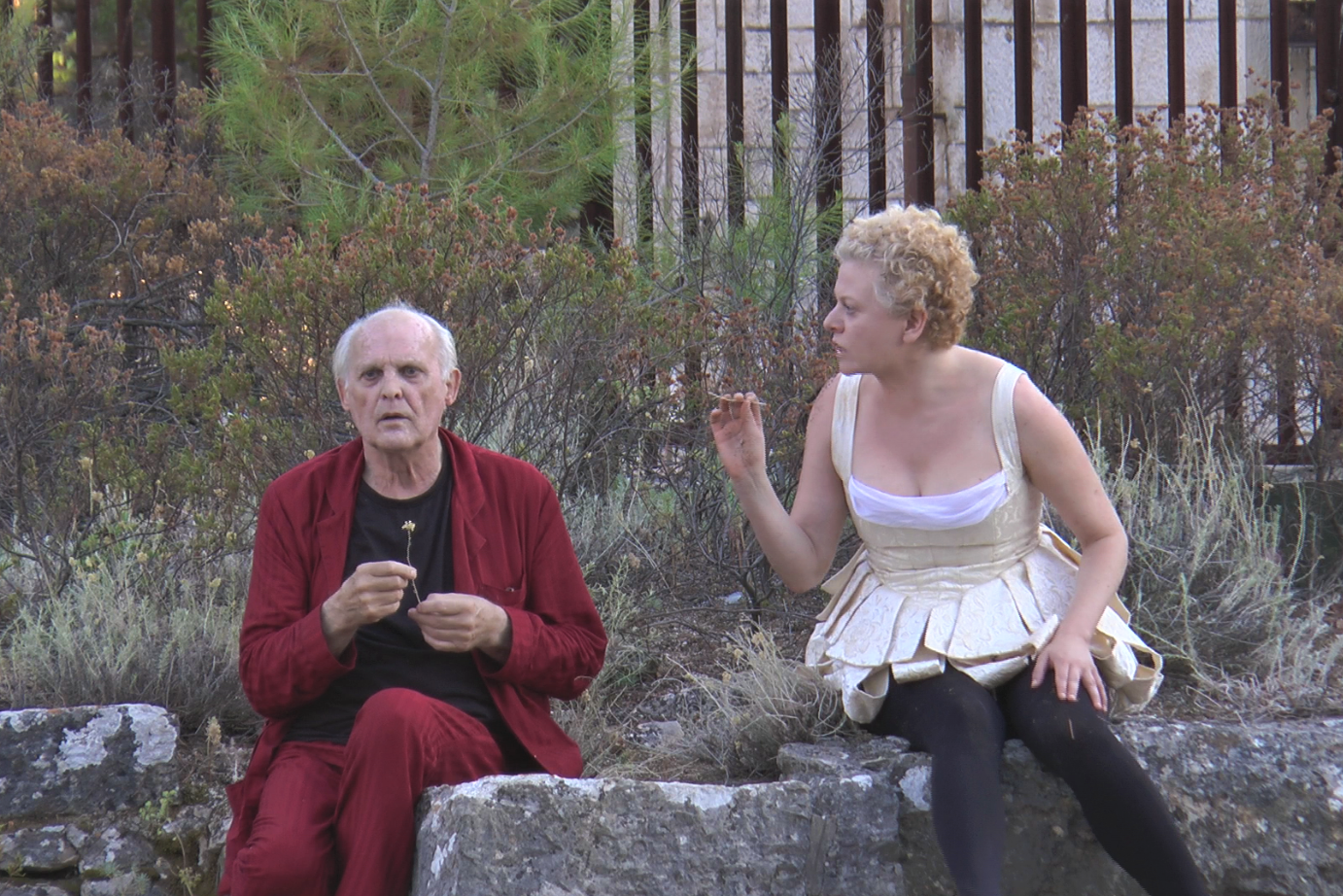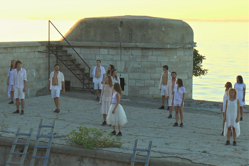 Praćeni zlokobnom pjesmom Vještice (Maja Posavec) po dolasku na obalu, gledatelji se smještaju na jutene vreće te gledaju u utvrdu na kojoj se u daljini nalaze studenti riječke Akademije primijenjene umjetnosti. Uz potmulo udaranje valova o stijene i zalazak sunca studenti se iznimno polako približavaju publici uz pratnju gudača. Tijekom poduže scene njihova kretanja, publika u tišini promatra more u gotovo antičkom okruženju te upija sve dijelove tog nevjerojatnog prizora. Ta je tišina uvertira u oluju koja zahvaća mornare i izbjeglice na moru, što je uvježbanim scenskim pokretom (Staša Zurovac) prikazano samo tijelima studenata i jednim konopom. Oluja je evocirana dojmljivim glazbenicima s dominantnim puhačkim instrumentima te, dok u pozadini plutaju prsluci za spašavanje, izbjeglice se nakon zastrašujuće i, nažalost, previše stvarne završnice u oluji strminama penju prema publici i započinju svoje vapaje. Odvažni i sigurni u kretnjama, studenti glume proslavili su se i monolozima u gotovo izravnom kontaktu s publikom uz osjetnu bol na licu i u glasu te poneku suzu, a sunčeva svjetlost u zalasku dodatno je naglašavala učmalost životne situacije njihovih likova..png)