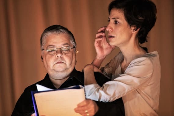 Pritom sva lica koja se pojavljuju u sjećanjima Cristine Vidal tumači vrsni glumački ansambl: Beatriz Maia, Isabel Abreu, Marco Mendonça, Romeu Costa i Sara Barros Leitão, izmjenjujući se u ulogama glumaca kojih se Vidal ponajviše sjeća, a i glumice koja je postala ravnateljica i koja je ne samo angažirala protagonisticu kao šaptačicu nego i uspostavila poseban odnos povjerenja prema njoj. Uz to igraju i sadašnjeg ravnatelja kazališta koji je na kraju uspio uvjeriti šaptačicu u smisao svog kompleksnog projekta, a i samu šaptačicu (u čemu se izmjenjuju čak dvije mlade glumice). Međutim, stvarna Cristina Vidal ostaje cijelo vrijeme na sceni, trudeći se biti što manje vidljiva dok slijedi glumce šapćući im (gledateljima gotovo potpuno nečujno) i povremeno ih pokretom navodeći na točnu interpretaciju teksta koji ostvaruje njenu složenu viziju vlastitog svijeta, kojoj je impresivna Rodriguesova interpretacija dala iznimnu dojmljivost i kompleksnost značenja.