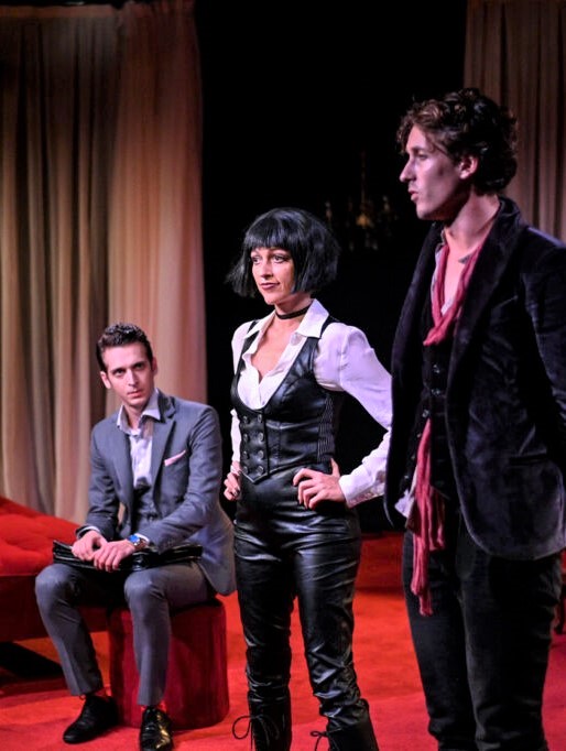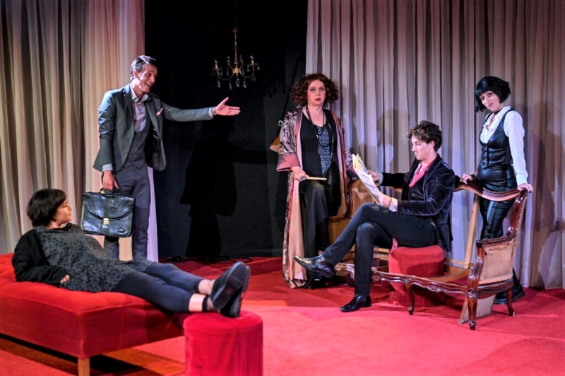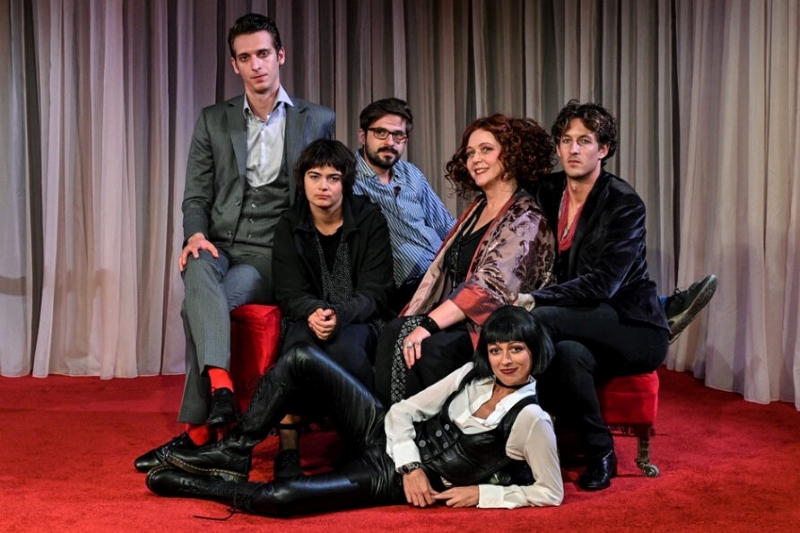 Glumaca je petero i svi igraju uloge čiji se paralelizmi mogu tražiti u nekima od likova kanonskih komada koje Vlašić parodira. Pri tome nisu uvijek jednoznačni, no pravilnosti su uočljive. Tako Ljiljana Bogojević igra Gospođu Melankoliju, postariju glumicu koja tri puta godišnje slavi jubileje, stalno na rubu karikature, no ne upada u nju nego se snalazi u parodiranju sličnih likova iz dramske literature - od Barunice Castelli do Filomene Marturano. Robert Španić Pjesnika je donio suzdržano, ponešto konvencionalno u ironiziranju lika koji je ovdje, ali kao da nije prisutan mislima.