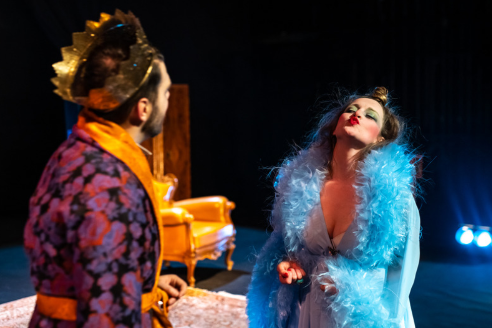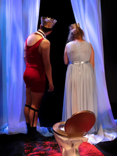 Ludilo bračnog para u predstavi očituje se, između ostalog, i u tome kako oni pijuckaju čaj i razglabaju o banalnim stvarima kao da pod njihovim prozorom ne pucaju granate i vani ne bjesni rat. Čekaju samo da se to smiri kako bi stavili na glavu svoje šešire tj. krune i otišli u šetnju kao da čekaju da stane kiša. Njezino je ludilo izvrsno prikazano u prizoru u kojem neprestano manijakalno češlja kosu, dok si on neprestano toči čaj iz kristalnog čajnika i ne skida krunu s glave, iako je čitavo vrijeme kod kuće i u kućnom ogrtaču.Iako ima krunu na glavi, ni po čemu se ne da zaključiti da je on doista i kralj, jer se uopće tako ne ponaša. Dosjetljivo je nasred scene postavljena WC školjka na koju oboje odlaze obaviti nuždu i time se daje dojam kako je njihov život neodvojiv, kako nema privatnost i koliko su njih dvoje, unatoč svemu, bliski.