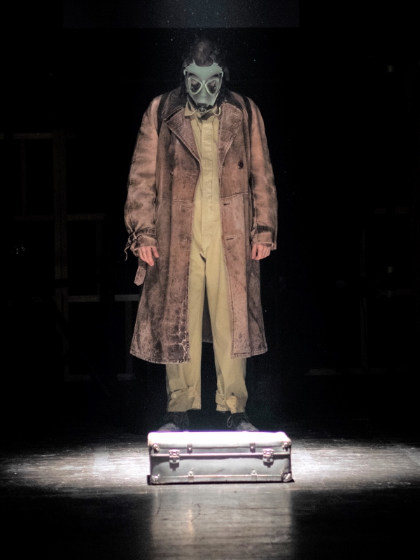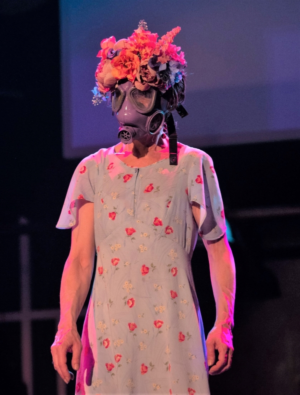Kostimografija Marite Ćopo u potpunosti je u funkciji predstave, a pritom se najviše ističu jezive plinske maske, koje do izražaja najviše dolaze u kombinaciji s plavom haljinom cvjetnog uzorka Doris Šarić Kukuljice. Tom se scenom dodatno naglašava morbidnost cjelokupne situacije, a postapokaliptični izumi njezinog supruga i zvučne snimke televizijskih i radijskih vijesti pridonose anksioznosti i skučenosti takvog života.