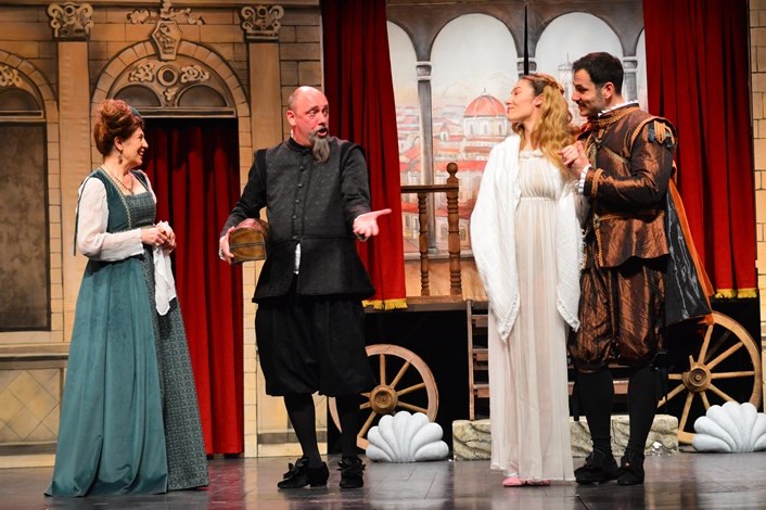 Na početku, scena se rastvara iz kazališnih kola, što možda i nije povijesno sasvim točno, ali Komedijina izvedba i ne stremi biti povijesno osviještena nego se koristi povijesnim stilizacijama kako bi kreirala posvema klasičnu, školsku inscenaciju poznatog teksta. Glazba (Mate Matišić) nije izuzetak – zanimljiva je, ali ne i posebno pamtljiva, pjeva se i na talijanskom, što pomalo remeti tijek događaja i nije smisleno uklopljeno u cjelinu. Sve je u ovoj predstavi nekako očekivano i zanatski. Tekst je postavljen bez pretjeranih intervencija (što je dobro, jer pokazuje njegovu trajnu aktualnost i činjenicu da i danas bez problema drži publiku zainteresiranom), scena je takva, kostimi su takvi. I glumačke izvedbe.