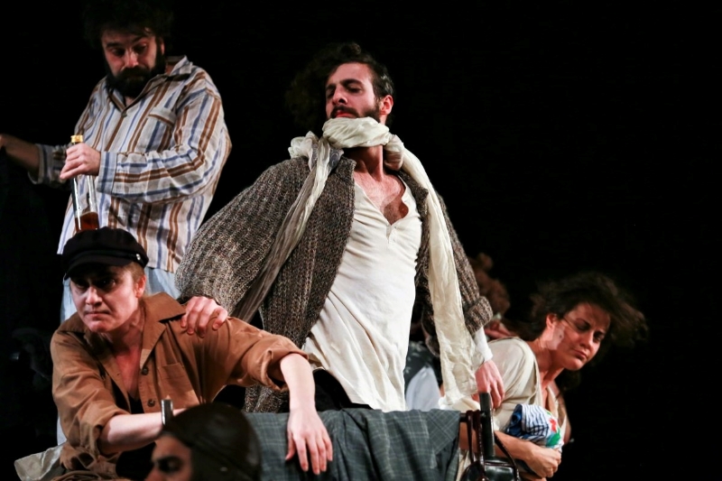 Vidljivo je to već od prve scene, kada na mračnu pozornicu uz strahovitu buku i bijes provaljuje horda mračnih spodoba koja već samom pojavom pokazuje da su tumači naslovne uloge. Obitelj je to Mazzatella, koju vodi autoritarni pater familias Giacinto u pohodu prema gledalištu, izgovarajući pritom brojne psovke i vulgarnosti kao jedan od niza bisera izvanredno sugestivne interpretacije zagrebačkog gosta Ozrena Grabarića. Iako i u filmu postoji niz vulgarnosti, ove uvodne u predstavi asociraju na fesceninske stihove – grube rugalice rimskih seljaka iz davnih vremena za koje postoje pretpostavke da predstavljaju ishodiše prvih rimskih kazališnih predstava. Vrlo uspjela scenografija Aleksandra Denića definira prostor igre kao specifično teatarski.