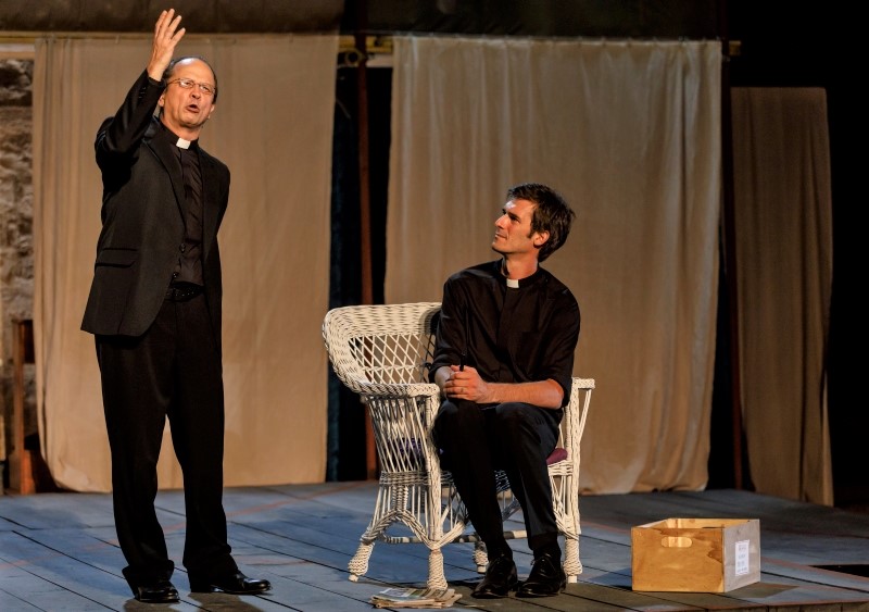 Međutim, poštovanje fakture teksta ne jamči i poštovanje njegova duha, a koji vodi prema žanrovskom određenju. Cjelina splitske Glorije tako je donekle u raskoraku prema onome kako se taj komad tradicionalno doživljava i žanrovski percipira. Glorija je, naime, nakon praizvedbe doživljena, a ta se interpretacija provlačila i provlači do danas, kao subverzivni komad, drama koja propituje ideale i institucije, ljudsku individualnost i intelekt, žensku samobitnost i muške pokušaje upravljanja osjećajima. Umjesto toga, u Splitu je – ponajprije zahvaljujući glumačkim ostvarenjima uloga i to prvenstveno onih muških, rezultat ispao puno više komedija karaktera nego subverzija ideja i manipulacija ljudskim emocijama. Dinamika svećeničkog četverolista – don Jere (Mijo Jurišić), intriganta i pokretača cijele operacije pretvaranja sestre Magdalene u živi kip Gospe na oltaru, sarkastičnog don Zane (Trpimir Jurkić), koji je svojedobno neslavno propao sa sličnim mirakulom pretvaranja crkvenjaka Tome u uličnog Antikrista, rezigniranog, užicima predanog don Florija (Nenad Srdelić) i umornog, djetinjastog biskupa (Filip Radoš), postavljena je stalno na rubu karikature, sa sarkastičnim podbadanjima i isticanjem karakternih mana, što osobito u prvom dijelu predstave preuzima dominaciju nad sadržajem. Ipak, u tome su odreda vrlo dobri te je, unatoč stanovitoj redukciji značenja, užitak gledati podbadanja između Jurkića i Jurišića, a ne zaostaju mnogo ni Radoš, pa ni Srdelić.