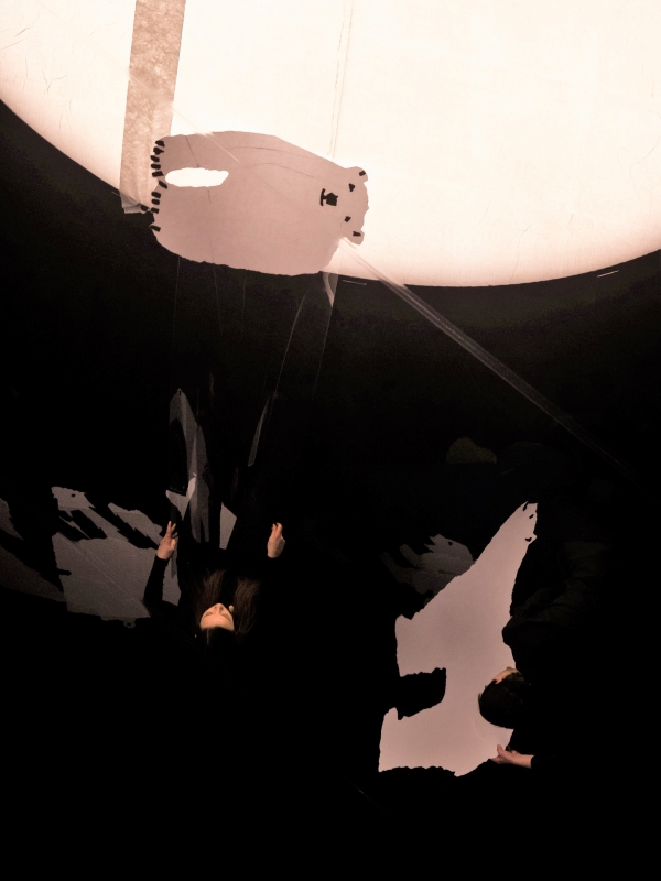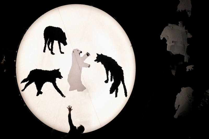 Iako je gostovalo na lutkarskom festivalu i svakako ima određene lutkarske elemente koji dobro izgledaju i precizno su izvedeni, Nebo iznad nas ipak je prvenstveno pripovijedanje, predstava-priča s porukom, u kojoj je intrinzična kazališnost sporedna. Ta poruka je ekološka, s očitim ciljem senzibiliziranja djece (a onda, vjerojatno, i njihovih roditelja) za posljedice globalnog zagrijavanja i klimatskim promjenama. Zadatak se ostvaruje kroz priču o ugrožavanju staništa polarnih medvjeda, suočavanju jedne obitelji tih životinja s topljenjem ledenog pokrivača, zagrijavanjem mora i manjim brojem tuljana koje mogu uhvatiti. Sve je, dakle, sasvim jasno, ali i sasvim očekivano u toj priči – maloj djeci koja se nisu susrela sa sličnim pričama (možda) zanimljivo, ali nekako tipično i svima malo starijima već mnogo puta viđeno i ispripovijedano. I bilo bi sve u redu i vrijedno pažnje, pa i pohvale zanimljivog i kvalitetnog angažiranog kazališta, da nije problema s početka odlomka.Naime, Nebo iznad nas jest kazališni dokumentarac u sadržajnom, motivskom smislu, no u izvedbenom je umnogome kazališna ilustracija. Glumci se kreću oko kružno postavljenog osvijetljenog elementa položenog na pozorničke daske, s kojeg se u modificiranoj varijanti kazališta sjena na platno rastegnuto iznad pod odgovarajućim kutom, upotrebom plošnih lutaka, stvara svijet medvjeda i njihovog polarnog staništa. Postupak koji dobro izgleda, precizno je izveden i ugodno podcrtan lijepom glazbom, no kojem kako predstava odmiče (a ne traje dugo, tek četrdesetak minuta) počinje nedostajati dinamike, osobito jer je količina teksta nesklapna s brzinom promjena te se likovi na platnu uskoro počinju doimati kao ilustracija za izrečeno, a tada ni tezičnost koju ovakva, angažirana predstava nužno sa sobom nosi ne pomaže.