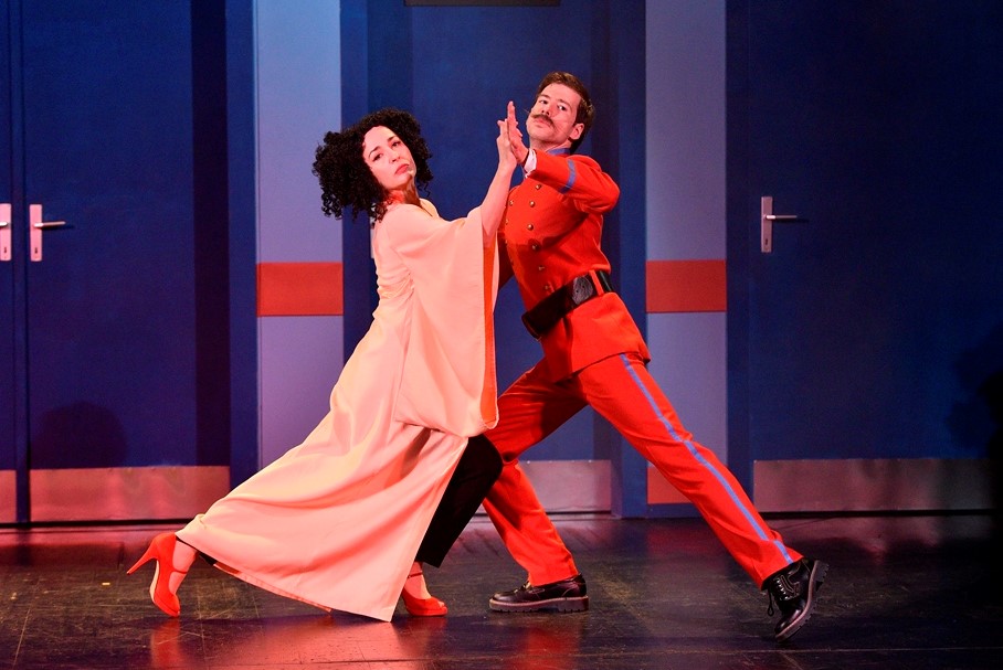 U predstavi se humor podjednako gradi pomoću teksta, različitih vrsta komediografske glumačke igre i pokreta koji je, uglavnom u maniri animiranih filmova, osmislila Nikolina Medak. Vesela glazba Stanislava Kovačića također podsjeća na crtiće pa se te dvije umjetnosti u predstavi na lijepi način isprepleću. Kostimografkinja Barbara Bourek glavne osobine likova uspjela je dočarati pomoću detalja u kostimu – redatelj nosi crveni šal, čime se ističe njegova umišljenost i poimanje sebe kao velikog umjetnika, piščevu pristojnost i uglađenost otkriva crvena leptir-mašna, starija glumica odjevena je elegantno a mlađa moderno, casual. Nedozrelost mladog ambicioznog glumca ističe se žutom kapom, a opuštenost i nezainteresiranost starijega glumca neuglednom sivom majicom i crnim prslukom. Dubravka Lelas odjevena je pomalo klaunski, što odgovara njezinoj glumačkoj igri – ima hlače na tregere sa šarenim zakrpama ispod kojih je majica s crvenim prugama. Tajnice umjesto šešira na glavi imaju telefon, a ravnatelj je u poslovnom odijelu. Portir se kao narator izdvaja od svih ostalih, sa svojom elegantnom crvenom uniformom koja podsjeća na neka bolja, prošla vremena, kada se kazalište smatralo hramom umjetnosti.