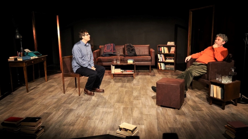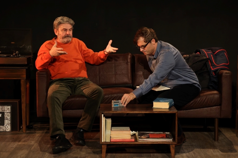 U ulozi je pisca nobelovca Abela Znorka psihološki uvjerljivo i snažno glumac Aleksandar Cvjetković, a novinara Erica Larsena glumi temeljito uigran Mirko Soldano. Komorni, intimni prostor scene, zamišljen kao dnevni boravak u koji ulazi i boravi i publika, u toplim je tonovima. Donose ih i smeđe boje tkanine kojom su obloženi trosjed i fotelja, ali tople tonove donosi i glazba koja dolazi s gramofonske ploče – slušamo Enigmatske varijacije engleskog skladatelja Edwarda Elgara nastale krajem 19. stoljeća.