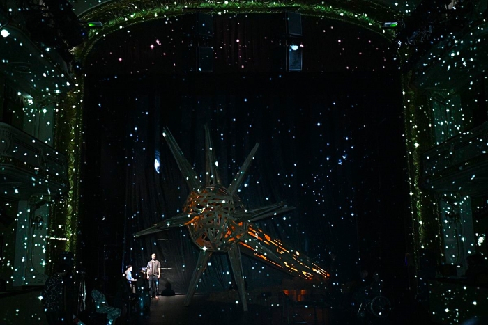 Ljubljansko kazalište dočekalo nas je okovano izvanjskim skelama, ali u unutrašnjosti krajnje susretljivo i kazališno nadahnuto, s maštovito scenski uređenom kavanom i balkonom, ukusnom kavom i kolačima i sa sjećanjem na izvrsnu predstavu, monodramu Djevojčica sa žicama praizvedenu 26. svibnja 2018., nastalu na temelju naručena teksta hrvatske autorice Maje Hrgović i u režiji, glazbi i scenografiji makedonskog autora Marjana Nečaka, s Anom Bunteskom kao autoricom stihova. „Ova je „suvremena dramska opera“, „metaforična dramsko-glazbena partitura“ promijenila barem dio vizure kazališta, umjetnosti i europskih strahova i nadanja. Uz velike pohvale treba spomenuti i mogućnost usporedbe s Dnevnikom jednog luđaka, monooperom bitolskoga teatra Marjana Nečaka, Ozrena Grabarića i Marina Lukanovića iz 2017. na Sceni Ribnjak u Zagrebu, prema Gogoljevu tekstu. Slika kutije kao zatvora i alegorija vladanja svjetskih sila nad malim čovjekom, duševna kriza na zidu osamljenosti poveziva s Bulgakovom, represivnim sustavima i svijetom u kojemu dom ne mogu naći milijuni raseljenih duša pridonose karizmatičnim učincima obiju predstava pred gledateljima kojima daju nadu u život bez žica, a sa strunama glazbene i glumačke umjetnosti“ (Mira Muhoberac, Vijenac), koju smo gledale na Maloj sceni SNG-a (na premijeri je bila i autorica) i koju je, oduševljena izvedbom, moja sestra Mira Muhoberac kao izbornica pozvala na Marulićeve dane (Marul za umjetničko ostvarenje pripao je Marjanu Nećaku). I u subotu smo, 7. listopada 2023., na Veliku scenu ušle u gledalište s posvećenim, teatarski znalačkim gledateljima, ali i velikom zvijezdom na sceni, gotovo replikom svemirskoga satelita, Trojanskoga konja, Atomiuma (110 m visoke čelično-aluminijske konstrukcije izgrađene u čast Svjetske izložbe 1958.) u Bruxellesu, divova i vjetrenjača iz Cervantesova Don Quijotea, a svaki se od ovih asocijativnih znakova može višestruko semiotički detektirati. Jutarnja je zvijezda građena od recikliranoga materijala i/ili drva koje igrom svjetla dobiva zlataste boje, a sijeno je ispod nje kao svijetleća nebeska međuplanetarna prašina, svemirska prašina sastavljena od malih čestica koje lebde u svemirskom prostranstvu (scenograf: Aleksandar Denić). Bez kazališnoga svjetla malo je iluzije, samo konstatacija da tako velika zvijezda stoji na sceni, dominantna i nepomična. Kako je kazalište nesaglediva iluzija, tako predstava Jutarnja zvijezda (Miško je nekoliko sati bio u Pasjoj postaji) počinje gašenjem svjetla i titrajućim zvijezdama u cijelome gledalištu i na sceni, što u publici izazove duboke odobravajuće uzdahe uhvaćenosti u trenutak nestvarne priče i uvučenosti u događaj iz kojega danima treba postupno izlaziti, ushićenosti kazalištem.
