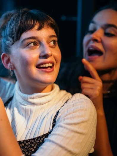 Autorica predloška i redateljica ženske predstave Ivana Vuković i dramaturginja ženske predstave Nina Gojić mudro su odabrale dvije izvrsne mlade glumice, također suatorice ženske izvedbe i glavnih i sporednih ženskih uloga, Lanu Menigu i Nikolinu Prkačin. Kao izvođačice i sukreatorice zbivanja na sceni čitavo vrijeme izvedbe balansiraju između svojih izvođačkih osobnosti, stvarajući predstavu o ženskom identitetu, te dviju djevojčica koje igraju, čija lica grade tijekom izvedbe. One su Mara i Lenu, imena su im uvjetovana obiteljskim kontekstom i siromaštvom, s čime se također vrlo brutalno (jer feminizam je zaista usko vezan uz klasno pitanje), namjerno iritantno, crno i nemilosrdno sprdaju. Čitav izvedbeni ton njihovog iskaza je tako sročen, što prati senzibilitet suvremene odraslije djece na pragu tinejdžerskog doba. One su upravo to, djevojčice koje nisu još zakoračile u svijet odraslih, dovoljno odrasle da ga mogu promatrati, o njemu zaključivati ali ga još uvijek i oponašati bez osviještenosti i samim time, bez bilo kakve (prisilne) političke korektnosti. Znaju da ih čeka korak u svijet odraslih, nisu još dobile prvu menstruaciju ali znaju da slijedi, pa im to otvara prostor slobode da misle kako mogu biti sve što žele. Jedan od zaključaka, a spominje ga djevojčica na sceni, jest i taj da zapravo želi imati samo hrpu novca, da ne mora ništa raditi, i da će tek tako moći biti sve što želi. Navedeni primjer izvrsno ocrtava, kao pravi pars pro toto, ideju izvedbe – kroz potpuno neopterećen razgovor i igru propuštaju se rečenice koje bolno točno govore o svijesti i svakodnevici suvremene djece i mladih. S opravdanom dozom hiperbolizacije govore i o onome što čuju o ženama: igraju, bivajući okrutne jedna prema drugoj, kvizove u kojima je točan odgovor na pitanje o tome što je žena: „maligna izraslina oko ženskih vanjskih spolnih organa (op. ur. parafraza vulgarizma)“.