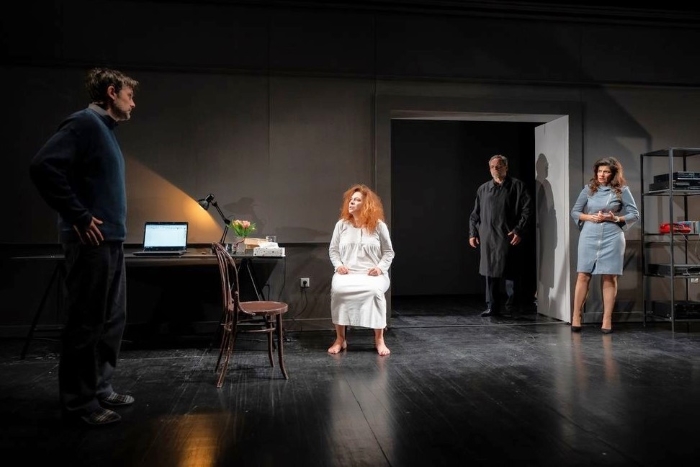 U gotovo bezbojnoj, neutralnoj, sivkasto-plavkastoj sobi sjedi za računalom, publici okrenut leđima, u kostimu sličnih boja kostimografkinje Marite Ćopo (asistentica kostimografkinje: Dora Črnjević), pirandellovski i samotnjački piše ovu istu dramu koju publika gleda, ali i dočekuje druge i drugo, uvijek kao inspiraciju za nove dramske situacije. Prvo dolazi njegova žena Ana, zanimljivo izabrana u glumačkoj podjeli, samozatajna izvrsna glumica Antonija Stanišić Šperanda, koja i u ovoj ulozi pokazuje glumačku inteligenciju, suzdržanost i uvjerljivost, vjerovanje mužu i mudro isplivavanje iz dramaturški i životno teških situacija. Poslije u njihov stan dolazi muškarac, izvrstan Filip Šovagović, scenski vrlo ozbiljno postavljen, glumac koji se profilirao u vrsnoga komičara posebnoga koda koji na početku predstave izaziva salve iskrenoga smijeha u gledalištu do zadnjega mjesta popunjenome kazalištarcima, ali i političkim uzvanicima (u prvome redu iza diazome, širega prolaza), koji u demokratičnoj Gavelli nemaju vrhunaravni, nego samo ugodnodomaćinski tretman, što svima, čini se, odgovara. Posljednja dolazi Jelena Miholjević, glumica koja u desetak dana Male i Velike Gavelle ostvaruje nekoliko izvrsnih premijernih uloga, kao psihički bolesna žena Lidija, Fabijanova sestra, koja u bijeloj bolesničkoj halji, spavaćici, raščupana i sporih, teških pokreta, na tankoj granici između komičnoga i tragičnoga progovara o svojoj (i pravoj) istini.