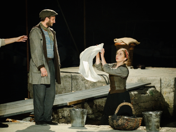 Kako scena nije dosljedno autentična, što se moglo izbjeći ostavljanjem nekih autohtonih barki i sl., a ne konstrukcijom rebara novih, tako je i pozicija i funkcija Iva Ledinića u interpretaciji Karla Mrkše ostala nedorečena, ako se cijela predstava ne čita kao stilizirana priča. Meštar Ivo trebao bi bolje realizirati svoju meštriju, jer mu je to jedna od temeljnih odrednica, a ne pomaže ni gluma en face nekih glumaca, možda zato što je gledalište preblizu, i na taj način pozornica gubi dubinu i oslanja se na kretanja lijevo-desno. Puk i djeca (koja su izvrsna, ali su, nažalost, prekratko na sceni), statisti (Jelica: Jelica Čučević, Tonći: Ante Tonći Đurković, Luka: Luka Bokić, Toma: Toma Tolj, Vicko Lise: Roko Roca, Nike: Nikolina Krupec, Mare: Nea Martinović, Pere: Petrunjela Baće, Perica: Nea Njirić, Baldo: Erin Saltarić) su dobro istrenirani, njihova je funkcija jasna, ali postoje samo kao sjene koje, koreografirane (koreografkinja: Zrinka Japunčić) bezglasno prolaze ili postaju zaleđene slike, ne čuje se ni žamor ni smijeh, a gesta također ostaje suspregnuta. Prema ideji inače izvrsne scenografkinje Dinke Jeričević na prostoru je Posata izgrađena kuća kapetana Dražića, zapravo njezina svojevrsna stilizacija, a druge se sobe i kuće realiziraju postavljanjem dijelova namještaja na pijesak, tako da i u tome scenskome kodu postoji određeno nesuglasje. Kostimi Lea Kulaša su kvalitetni, osmišljeni do najmanjega detalja, usklađeni s karakterima i osobnostima, ali previše uredni za dočaravanje svijeta siromaštva, tuge, jadnoga života koji svi žele promijeniti odlascima u inozemstvo iz kojega se rijetki vraćaju. Vrlo je dobra Anica Lara Nekić koju smo gledali i kao izvrsnu Anku u Dolenčićevu i Krležinu Kraljevu u Gavelli, dobro govori, uhvatila je dubrovački idiom hrvatskoga jezika, lijepo se kreće, uvjerljiva je, blagoga pokreta, pogođene emocije. Goran Grgić, pomorski kapetan Frano Dražić, njezin otac, napravio je vrlo kvalitetnu ulogu preispitujući poziciju oca i odnosa prema kćeri u cijeloj povijesti književnosti, svjestan teških odluka i trgovanja djecom, mučeći se sa sobom, psihički i tjelesno i loman i jak. Lucija, djevojka u Frana Dražića je Nika Lasić, u Juvančićevoj predstavi Anica, sveprisutna, precizna, odmjerena, s jasnim stavom i reakcijom. Maro Martinović preuzeo je ulogu Vlaha Slijepoga od Predraga Vušovića Pređa, što mu nimalo nije bilo lako – uvjerljiv je u sljepoći, sa Zrinkom Cvitešić u duetu uspijevajući rekonstruirati davno vrijeme i kolende koje su se čule po Gružu, kao Tiresija u tragedijama rekreirajući i prenoseći istinu koju vidi unutarnjim okom. Mirej Stanić izvrsno je i potresno ostvarila ulogu Mare Pendove, tragičnu glumačku minijaturu, svojom krhkom pojavom u crnini i krikom kad spozna istinu o nestalome mužu. Cijela je predstava mišljena iz perspektive barkarijola Pava u interpretaciji Joška Ševa koji zabrinuto i zamišljeno dočekuje publiku, anticipirajući budući splet događaja, kao sveprisutni komentator problematične nam zbilje, transformiran i tjelesno i facijalno, pokušavajući neuspješno pronaći sugovornika, osim ponekad svoje žene Kate, pouzdane Olivere Baljak, i tabak kao jedinu moguću utjehu pred katastrofom. U predstavi glume i Toni Perović: Toni Kukuljica, Parok: Branimir Vidić, Marija od poste: Perica Martinović, Marko Vojvodić: Maro Drobnić.