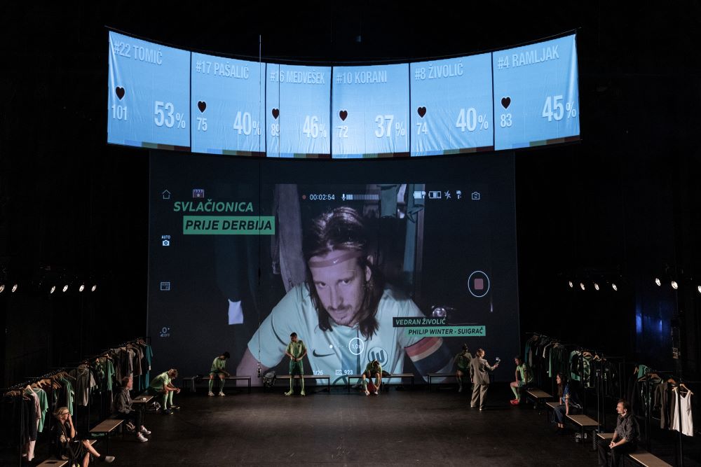 Moja mi je sestra Mira Muhoberac, dramaturginja i teatrologinja, govorila kako u Oslu, u velikome, novome, iznimno dobro opremljenome kazalištu svaki gledatelj ispred sebe ima ekran, tako da predstavu može gledati zumiranjem određenih glumaca ili detalja, sukreirajući predstavu, na što me podsjetila ova Šeparovićeva inovativna metoda (iako su Skandinavci prije dosta godina počeli implementirati filmove i izravna snimanja u svoje predstave). Na gornjim ekranima se za vrijeme treninga nogometaša-glumaca: Bernarda Tomića, Uga Koranija kao Slavena Matijevića, suigrača (koji se ponovno vraća u izvrsnu formu nakon nekoliko godina tjelesne neforme) između kojih je i jedna izvrsna nogometašica, i u ovoj ulozi izvrsna Anđela Ramljak, u punome treningu (suradnica za scenski pokret: Tamara Despot), očitavaju njihovi tjelesni parametri uživo, u realnome vremenu, sa stvarnim glumačkim prezimenima, tako da možemo pratiti njihovu formu, a kako bi se to moglo, imaju posebne sportsko-informatičke prsluke.