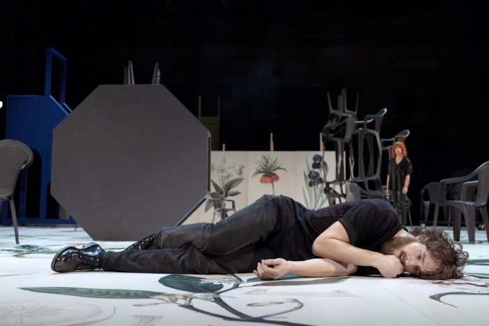 Svaki glumac ima svoje dijelove lingvističkih bravura u tekstu (dramaturg predstave je Goran Ferčec) koji se izgovara potpuno cjelovito, bez štrihova, u novome prijevodu Zlatka Wurzberga. Cijeli je scenski pod u kreaciji scenografa, Mauricija Ferlina i Josipa Kresovića, sastavljen od umjetnoga cvijeća, velikih naljepnica koje sugeriraju umjetn(ičk)e eksterijere, govornica-ormar je s lijeve strane, sve je funkcionalno i u cijelom kaosu kretanja i mijenjanja perspektive ima metode, veliki su oslikani panoi okrenuti naopako i mogli bi u nekom drugom vremenu, vremenskome kontekstu i predstavi kreirati neku drukčiju scenu, mnogobrojne stolice Ugo Korani kao stariji brat donosi na scenu i od njih iz(g)rađuje prave male skulpture koje, iako krhke, traju u svome kratkome kazališnome vremenu, pa se ponovno slažu jedna na drugu i odnose, a u novoj se sceni formiraju polukrugovi stolica za (ne)moguću komunikaciju (svjetla oblikuje Elvis Butković, a autor glazbe, elektronskih audiozapisa je Luka Prinčić). Impresivan je i okrugli stol kao rund-bina koju Korani okreće dok Luka Knez, mlađi brat, na njoj pokušava govoriti jedva se, ali ustrajno, održavajući u vrtnji. Zanimljiv je i veliki okrugli kotač koji glumci dokotrljaju na scenu kao podest ili kotač vremena koji se neupitno vrti, skulptura koja otuđeno i bezglavo sjedi na stolu, kao i dugi obiteljski stol prekriven plastikom na kojoj od gline nastaju amorfni oblici koji se gube u masi nedefiniranoga i neoblikovanoga zajedničkoga oblika.