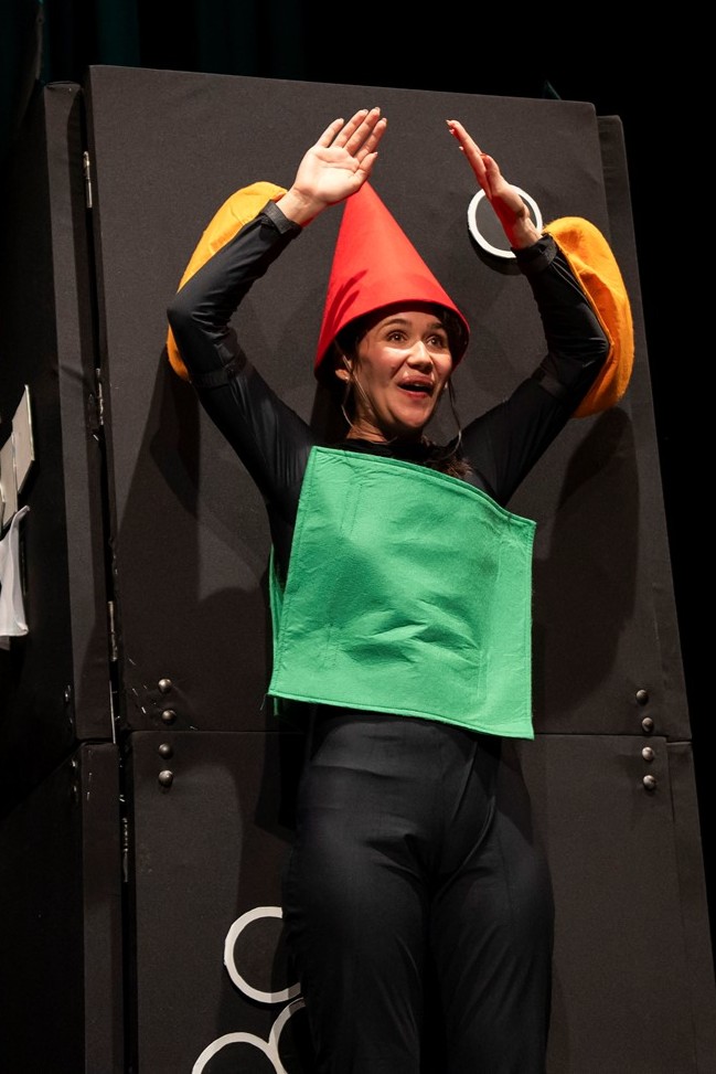 Malo glumačke tehnike i razumijevanja koncepta konačno unosi pojava drugog lica (lika od geometrijskih likova). Ovdje je to bila Buga Marija Šimić Milošev, ujedno i redateljica predstave. Međutim, cijela njezina igra postaje upitna jer nema jasne strukture, a bez pravila se jako teško doista igrati. Ova predstava stoga izlazi pred publiku kao filozofski pokušaj interaktivnih varijacija na nepostojeću temu. Oblici, likovi i predmeti ovdje samo jesu, a s njima se isprobava nešto, a da ni publika ni izvođači često ne znaju što.
