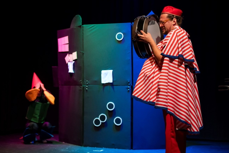 Osim udaraljki koje obuhvaćaju i dječji instrumentarij, predstava koristi trokrilni paravan (Emili Tomaić) na sredini pozornice za kazalište predmeta od geometrijskih oblika (likova) i sijalica. Odvija se ritimično gibanje predmeta: izvođač izvodi ritam, a sijalice, oblici ili čovjek (dijelovi tijela) se pokreću. Međutim, izvođač kao da nije sasvim uvjeren u to što radi ni što se događa, te nastupa s nejasnoćom koja je za izvođača općenito nedopustiva. Posebno je nedopustiva ako se pokušava ostvariti kontakt s djecom, kao što ova predstava u teoriji pokušava, jer se dječju publiku ne može prevariti. Njihova pažnja nije konvencionalna pažnja gledatelja koji će s pristojnom nezainteresiranošću otrpjeti predstavu.