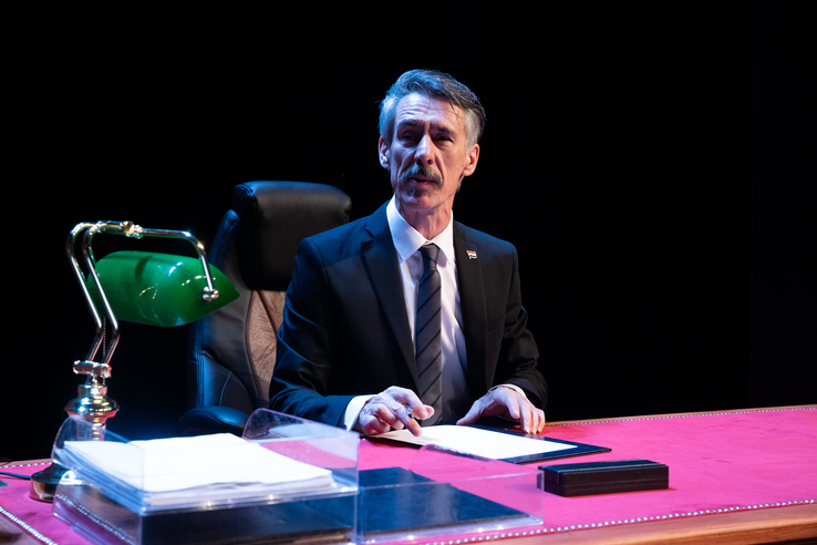 Uz prikladne kostime Vedrane Rapić, scenografkinja Marta Crnobrnja nije morala pogledati dalje od prvog najbližega gradskog i državnog prostora da bi scenski uspješno sažela bezlične i staromodne kancelarije u kojima čuče raznorazni referenti i koje su, kao i njihovi službenici, već godinama nepromijenjene. Ljudi i prostori napreduju prema upravljačkom vrhu po hijerarhijskom ključu: više i veće, pa se tako od referenata i njihovog šefa do ministra i potpredsjednice povećava veličina radnih stolova, ukrasnih biljaka te količina praznog uredskog prostora i njemu svojstvenog, nezgrapnog i dekorativnog kiča.
