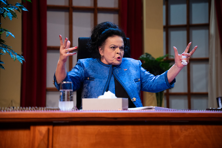 Sve apsurdnije činjenice i sve fantastičniji i zapetljaniji narativ ukazuju na to da imamo posla s potpuno izmišljenom stvarnošću. Tome se pridružuju i sve ekstravagantniji fizički obračuni sugovornika, iskorišteni kao video-intermezza koja su osmislili Nikola Čikos (animacija) i Mak Vejzović (video projekcije), a muzički obogatio Matija Antolić. U uredima ministri, šefovi i referenti piju, jedu i spavaju. Sve viši dužnosnici sve su neupućeniji, a naizgled sve detaljniji u istrazi slučaja pred kojim se nalaze. Napreduju i slapstick-sredstva; umjesto šakama (referenti) i stolcima (šef), ministar udara veslom, a potpredsjednica stijegom.